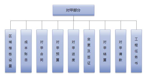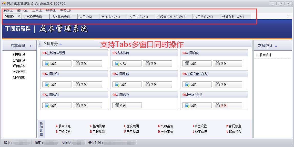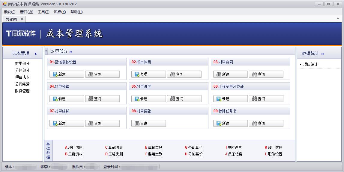 同尔成本管理系统(建筑公司版)包含:对甲部分、分包部分、项目成本、公司经营、财务管理、基础数据、系统管理七大部分。
