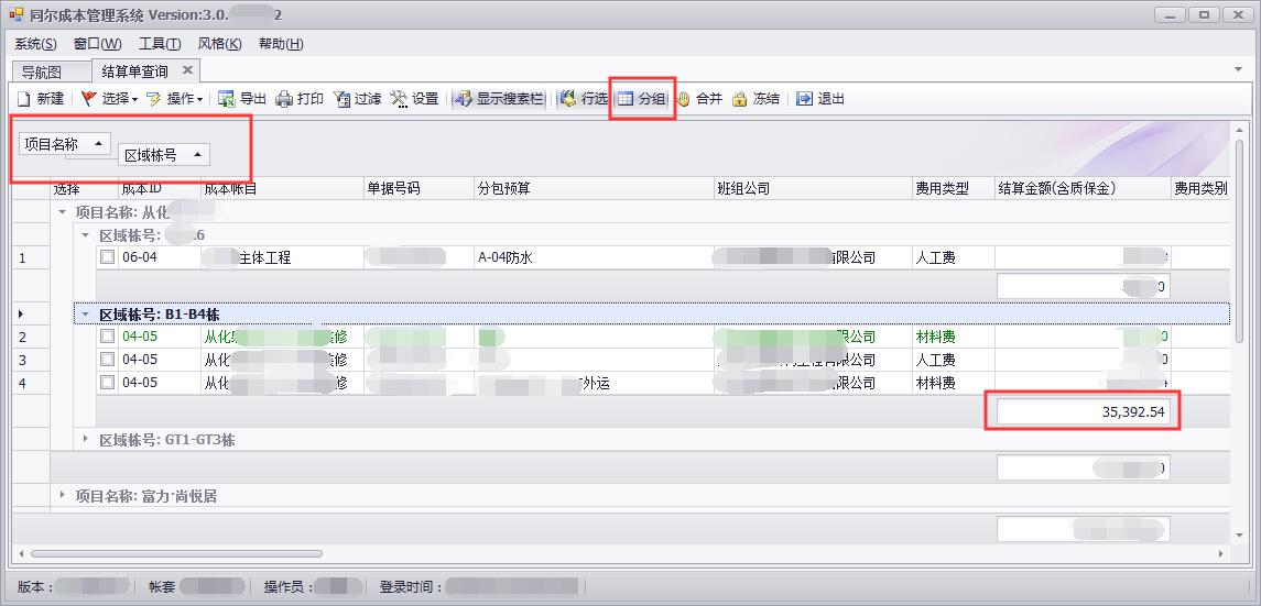 数据分组功能:可实现任意条件的数据分组统计、汇总、平均、最大值、最小值。如:统计从化**项目,按区域栋号进行统计,那么,按项目名称分组,再按区域栋号分组即可,如下图所示: